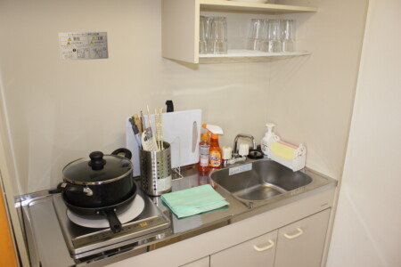 【電化製品】 ミニキッチン、モニター、冷蔵庫、電子レンジ、電気ケトル、扇風機、DVDプレイヤー(Blu-ray非対応)、クーラー