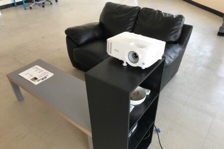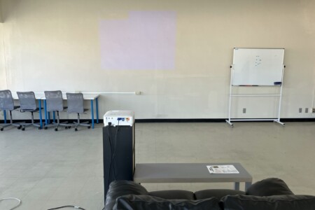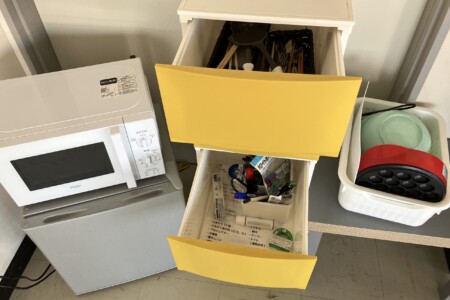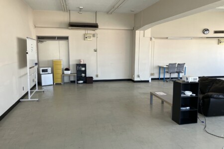 机(120×60)×3、椅子×20、ソファ、プロジェクター、冷蔵庫、電子レンジ、電気ケトル、ホットプレート、たこ焼き器、DVDプレイヤー、掃除機、バケツ、雑巾、クーラー、トイレ(建物共有)